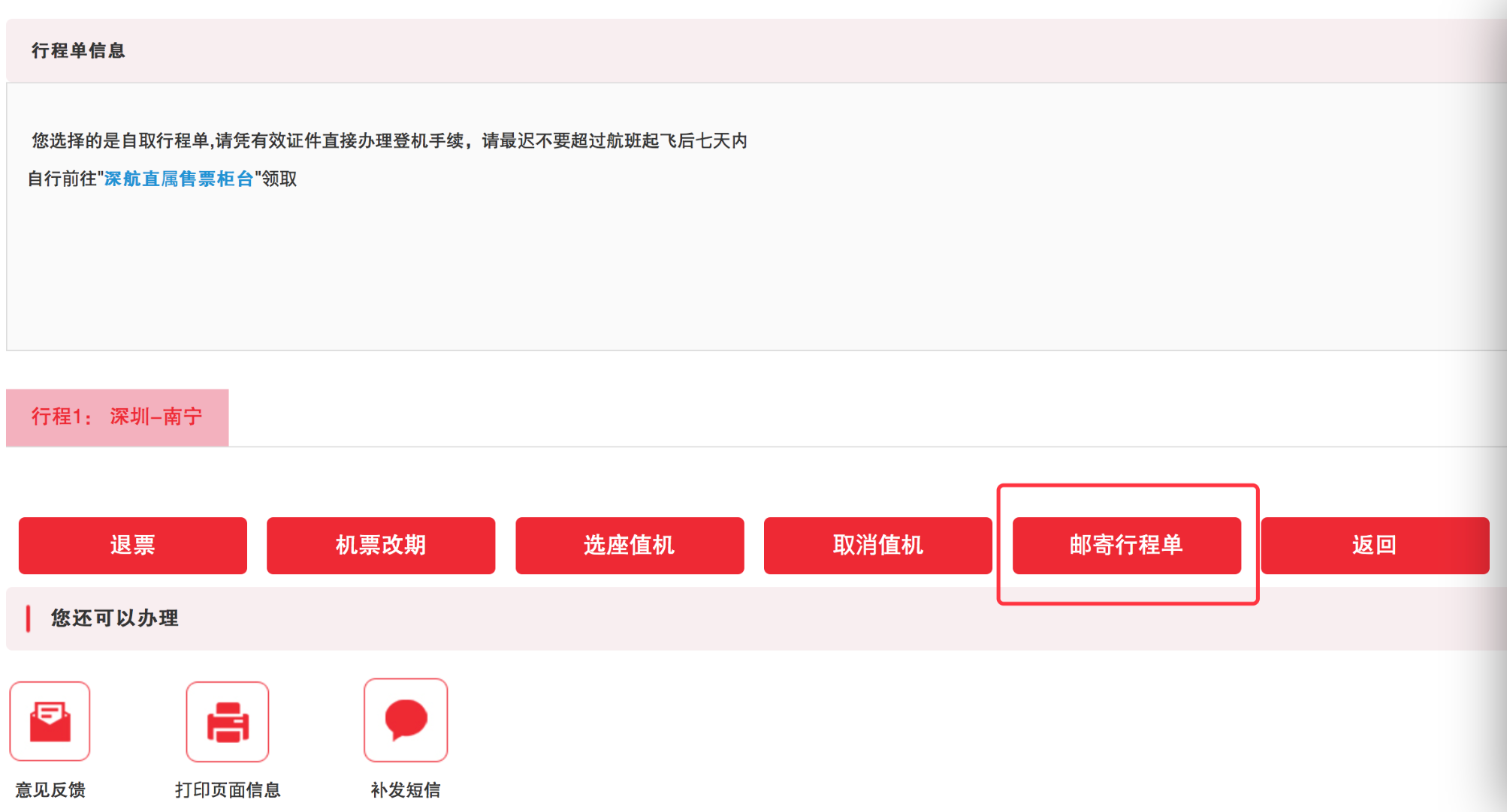 (2)如您尚未购票成功,请您预订机票以后,在成功支付机票票款的页面点击“邮寄行程单”,填写邮寄资料。
