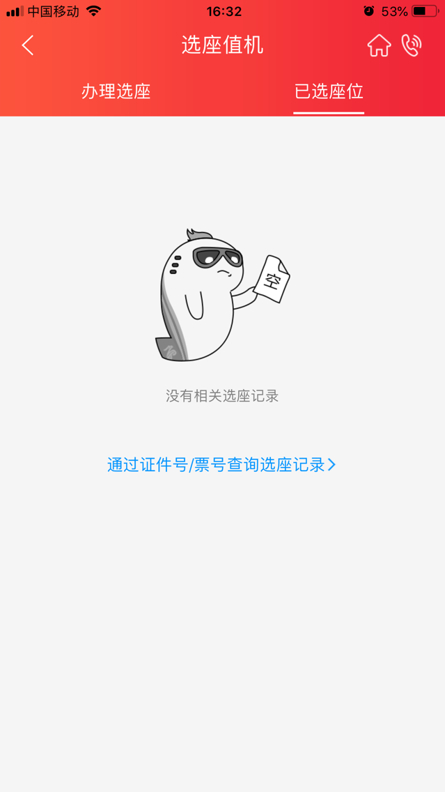 b.如果为未登录状态或已登录状态无记录,则点击下方“通过证件号/票号查询选座记录”按钮: